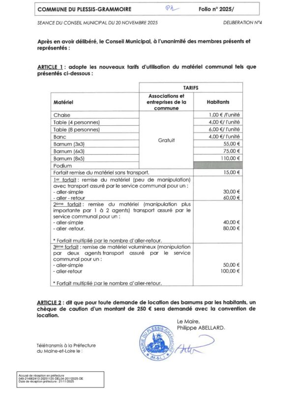 DEL04-20112025 REVISION TARIFS UTILISATION MATERIEL 01 01 2026
